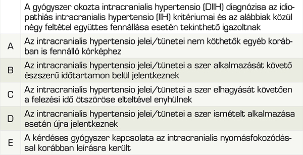 23 éves nőbetegünk 2024 májusában, bal szeme látóterében időnként feltűnő mozdulatlan homály panaszával jelentkezett szakrendelésünkön. Saját, korábban készült szemüvegével (–5,00Dsph/–5,75Dsph) korrigált látóélessége mindkét szemén 1,0 volt, az elvégzett fundusvizsgálat során pedig erős bal oldali túlsúlyú, mindkét oldali papillaödéma került észlelésre. A megjelenés napján sürgős ideggyógyászati konzíliumot kértünk, amely gócjelet nem talált, az elvégzett koponya CT-vizsgálat pedig nem igazolt térfoglalást. Szintén ekkor készült általános laborvizsgálatából hyperuricaemia mellett egyéb érdemi eltérés nem volt kiemelhető. A felsoroltak ismeretében a vizsgáló neurológus lumbálpunkció elvégzését nem ítélte szükségesnek az intracranialis hypertensio fennállásának igazolására. A fenti sürgős vizsgálatokat követő részletesebb anamnézisfelvétel során a beteg kérdésünkre számolt be arról, hogy panasza első észlelése előtt 7 nappal fejezte be háziorvosa által felső légúti panaszaira felírt napi 200 mg doxycyclin 10 napon át tartó szedését. A gyógyszer okozta intracranialis hypertensio Tan és munkatársai által felvázolt kritériumai így gyakorlatilag teljesültek (3) (1. táblázat).