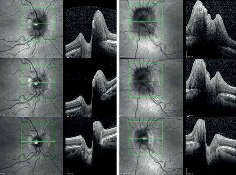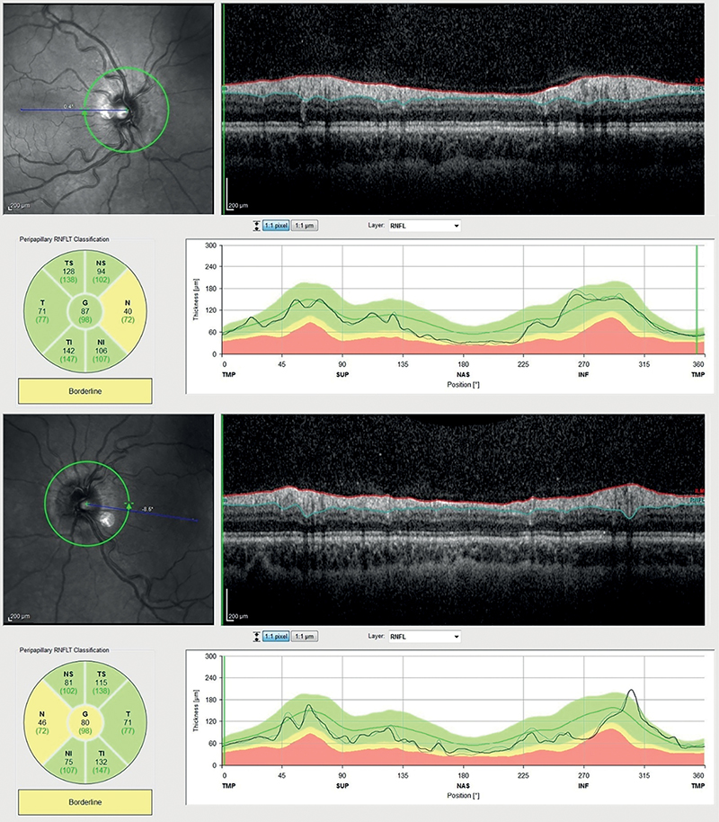 A tünetek és jelek alakulásából arra is következtethetünk, hogy a panaszok megszűnését követően is tartósan fennálló, lassan mérséklődő ödéma a panaszok jelentkezését is több nappal megelőzően indulhatott fejlődésnek, a doxycyclin szedésének befejezését követő 5 féléletidőn (100 óra) belül. Szintén az ödéma az észlelt panaszokat hosszan megelőző kialakulására utal, hogy betegünk első jelentkezésekor a mindkét oldalon megfigyelhető jelentős (2D/3D) prominentia ellenére csak bal szeme látóterében észlelt homályról számolt be. Jelenleg a 24 héten át fenntartott oralis acetazolamid terápia teljes elhagyását követően a beteg tartósan panaszmentes, korrigált látóélessége továbbra is mindkét szemen 1,0, látótere normalizálódott, a papillaödéma pedig mindkét oldalon tartósan megszűnt. A hosszan fennálló ödéma utóhatásának tekinthető a retinalis idegrostréteg (RNFL) mindkét oldali, nasalis kvadránsokban, OCT-vizsgálattal mérhető elvékonyodása, és a korábban fennálló ödéma aszimmetriájának megfelelő, bal oldalon alacsonyabb mérési értékek (3. ábra). Betegünk jelenleg a látóidegrost-veszteség ismeretében neuroprotektív céllal topicalis brimonidin monoterápiában részesül – szemnyomása ezen kezelés mellett ismételt mérésekkel igazoltan normál tartományban van. Fontos adalék, hogy a beteg szigorú diéta követésével kezelése ideje alatt 14 kilogramm testsúlycsökkenést is elért, ami feltehetően jelentősen hozzájárult a papillaödéma egyenletes mérséklődéséhez és megszűnéséhez.
