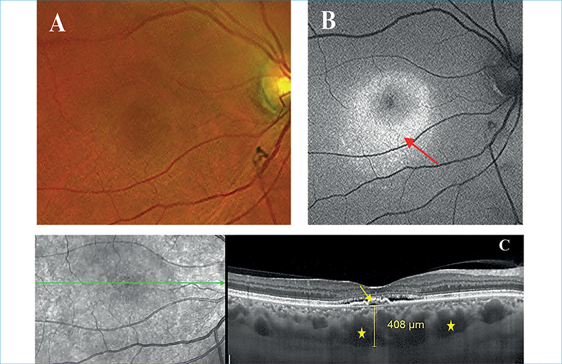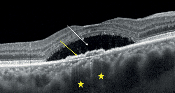 • IRF hiánya, • vastagabb chorioidea vagy dilatált Haller-réteg- erek (sárga csillagok)