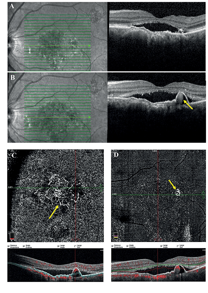 A polypoid léziók kialakulását serosanguinosus leválások kísérhetik, mivel azok vérzésre hajlamosak. Gyakran láthatunk nagyobb kiterjedésű subretinalis vérzéseket, vérzéses PED-eket, de a serosus PED-ek megjelenése sem ritka. OCT-felvételeken a PCV BNN része lapos, irreguláris vaszkularizált PED-ként jelenik meg, amelyet kettősréteg-jelnek nevezünk (DLS-double layer sign). A kettősréteg elnevezés itt az egymáshoz viszonylag közel elhelyezkedő RPE-réteget és alatta lévő Bruch-membránt jelenti. A polypoid léziók viszont sub-RPE gyűrűszerű léziókként ábrázolódnak, rendszerint csúcsos, hasadt vagy többszörös PED alatt. FLAG legtöbbször okkult membrán képét mutatja (ritkán, töri át a neovaszkularizáció az RPE-t, akkor ott klasszikus komponens képében jelentkezik), amely rendszerint kevésbé segíti az MNV 1-es típuson belüli PCV altípus meghatározását. A PCV aranystandard diagnosztikus módszere ugyanis az ICGA. A polypoid léziók nodularis hiperfluoreszcenciaként jelennek meg a korai ICGA fázisban (6 percen belül), késői fokozódással (pooling). A BNN detektálása nehezebb, kirajzolásukra a konfokális scanning lézer oftalmoszkóp (cSLO) alapú ICGA a legalkalmasabb, megjelenésük a ICGA korai fázisában várható a polypoid léziók megjelenése előtt. OCTA viszont a BNN ábrázolásában teljesít kimagaslóan, ugyanakkor a polypoid léziók nem mindegyike detektálható jól ezzel a modalitással, mivel rendszerint lassabb bennük az áramlás, mint a készülékek áramlást detektáló alsó határa (6. ábra) (9, 15, 43, 44).