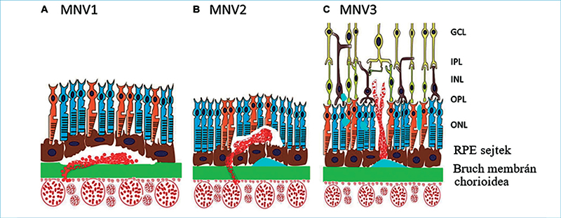- 3-as típusú MNV: a neovaszkularizáció a retina saját érhálózatából indul, általában a mély kapilláris plexus erekből és a külső retina és chorioidea irányába terjed potenciálisan retino-chorioidealis anasztomózisok létrehozásával. Ezért esetében a chorioidealis neovaszkularizáció megnevezés tehát helytelen (1. ábra) (44).
