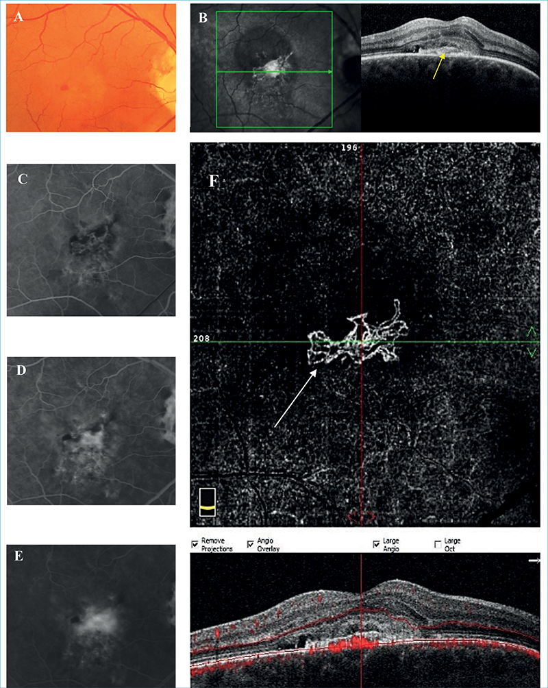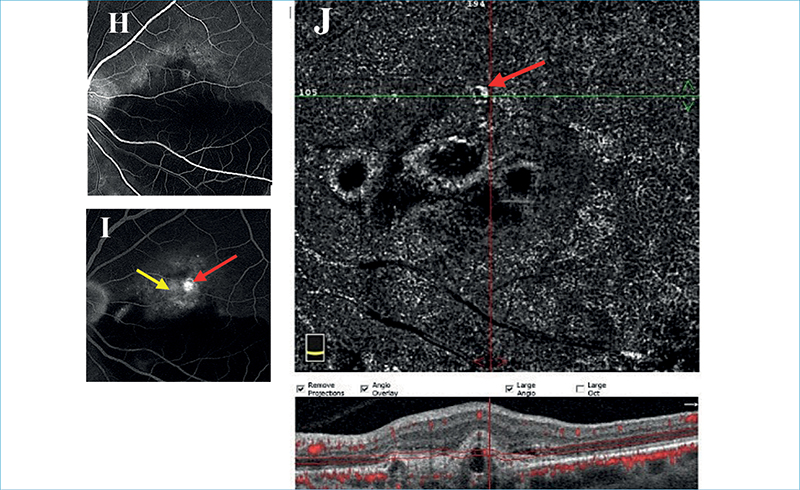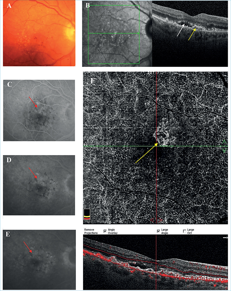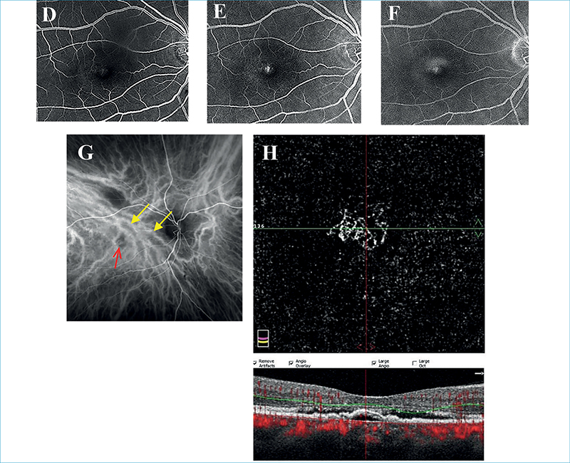 PCV-vel szintén közös vonása, hogy itt is 1-es típusú MNV alakul ki, gyakorlatilag egy polypoid lézió nélküli BNN-ről beszélhetünk. A szemfenéki képen nem specifikus, minimális pigmenteltérések láthatók. OCT-vizsgálattal az 1-es típusú MNV DLS-ként jelenik meg, aktivitására pedig a szintén jól látható subretinalis folyadék (SRF) jelenléte utalhat. FLAG okkult membrán mintázatát mutatja, ICGA rendszerint korai hiperfluoreszcens foltokat és BNN képét mutathatja a tágult chorioideaerek felett, a késő fázisban megjelenő chorioidea hiperpermeabilitással. OCTA a BNN kimutatásában az ICGA-hoz képest szuperior (7. ábra) (29, 36).