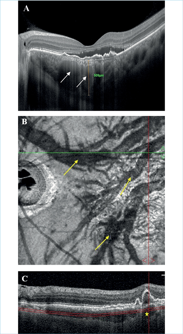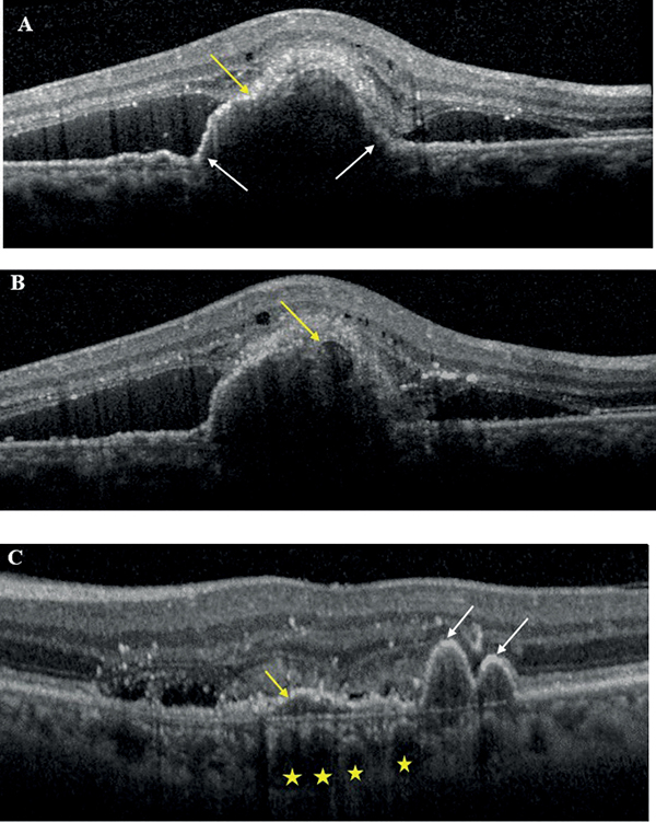 • C kép: többszörös PED (fehér nyilak), DLS (sárga nyíl), dilatált Haller-réteg-erek (sárga csillagok)
