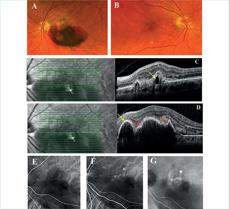• B kép: subpigmentepithelialis gyűrűszerű elváltozás (sárga nyíl)