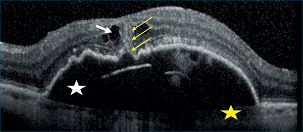 • subfovealis chorioidealis vastagság <200 µm (sárga csillag),