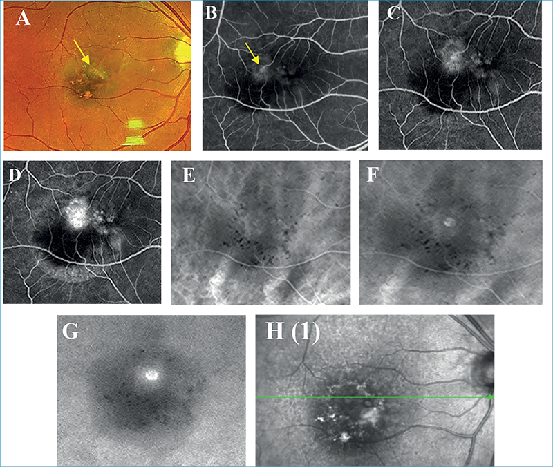 Az 1-es típusú MNV szemfenéki képe nem típusos, mivel az ereződés az RPE rétege alatt helyezkedik el, nehezítve ezzel annak megítélését, de az összes MNV kísérőtüneteként potenciálisan megjelenő intra/subretinalis megvastagodás, vérzés, kemény exsudatio, illetve különböző pigmentepithel-leválások (PED) felhívhatják rá a figyelmet. OCT-felvételen az 1-es típusú MNV fibrovaszkuláris/vaszkularizált PED-ként ábrázolódik, az RPE-réteg megszakadásának hiányával. FLAG-képeken nem éles határú, késői, térben is fokozódó hiperfluoreszcenciát (leakage) mutat, gyakran többszörös pontszerű vagy foltos hiperfluoreszcenciával, amelyet okkult membránnak nevezünk. ICGA sem tudja igazán az ereket jól kirajzolni, inkább csak a neovaszkuláris hálózat egy késői festődését (staining) mutatja, amelyet plakként definiálunk. OCTA rendszerint szépen kirajzolja a sub-RPE-térben elhelyezkedő neovaszkuláris léziót. Az OCTA annyira meggyőző, hogy számos tanulmány ennek a vizsgálati módnak a szuperioritását mutatja 1-es típusú MNV detektálásában ICGA-val szemben (2. ábra) (12, 13, 19, 47).