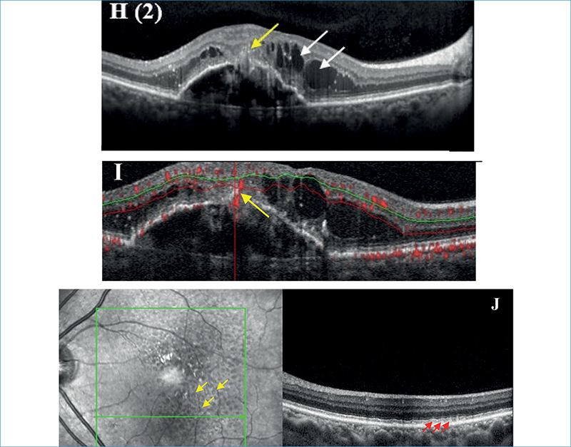 • C kép: többszörös PED (fehér nyilak), DLS (sárga nyíl), dilatált Haller-réteg-erek (sárga csillagok)
